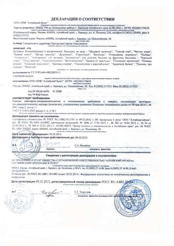Декларация ООО НПФ «Алтайский букет». Бальзамы безалкогольные на меду