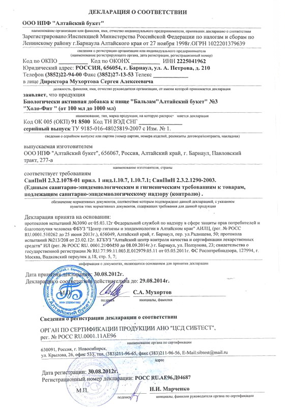 Декларация ООО НПФ «Алтайский букет». Бальзам «Холо-Фит».