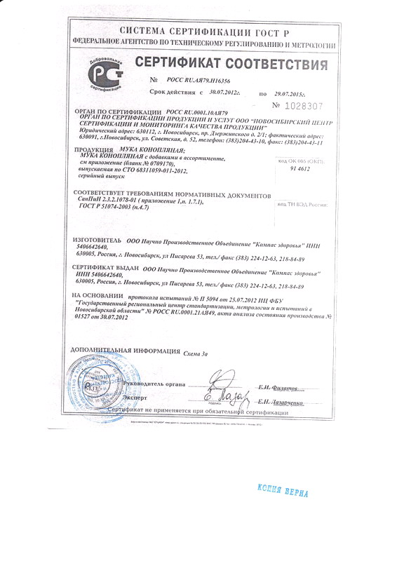 Сертификат НПО «Компас Здоровья». Мука конопляная