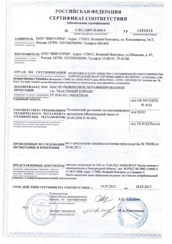Сертификат ООО «Виктория». Масло рыжиковое нерафинированное «Масляный король»