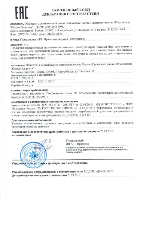 Декларация ООО НПО «Компас Здоровья». Шампуни серии «Нежный лен»