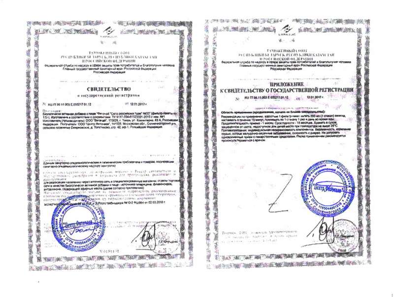 Свидетельство и приложение ООО «Центр Фиточаев». Фиточай №33