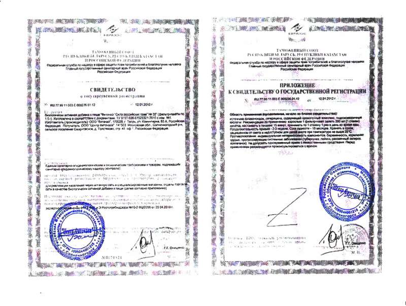 Свидетельство и приложение ООО «Центр Фиточаев». Фиточай №35