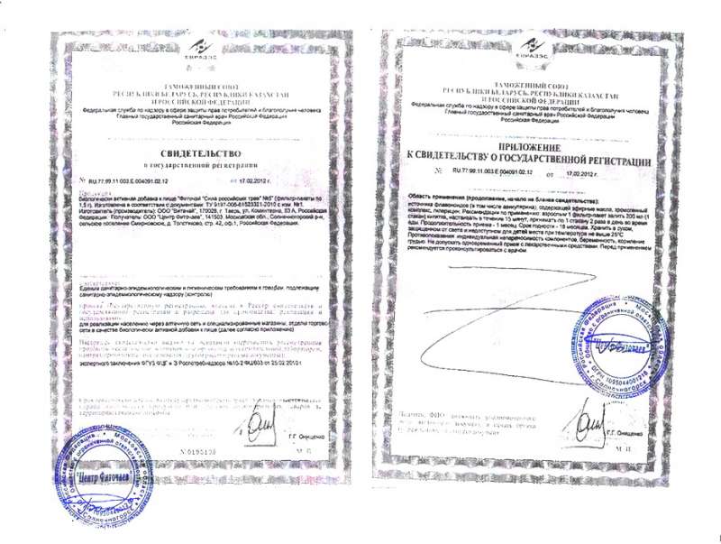 Свидетельство и приложение ООО «Центр Фиточаев». Фиточай №5