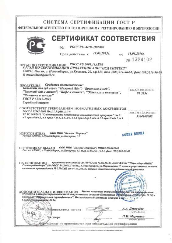 Сертификат НПО «Компас Здоровья». Бальзамы для губ