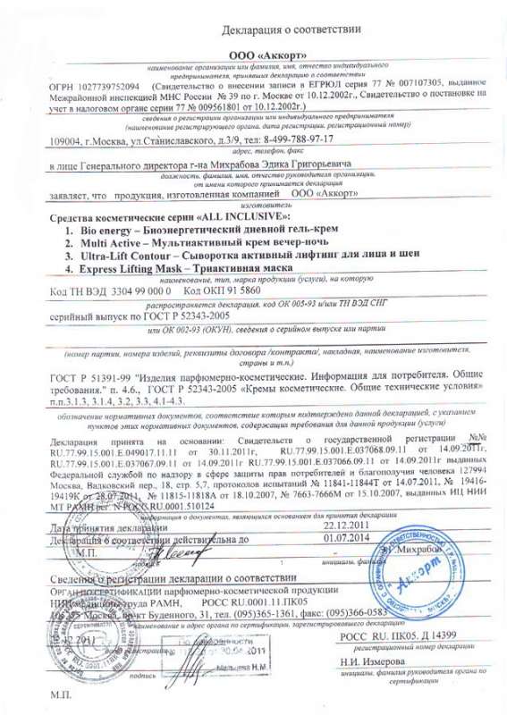 Декларация ООО «Аккорт». Косметика All Inclusive. Крем ночной и дневной