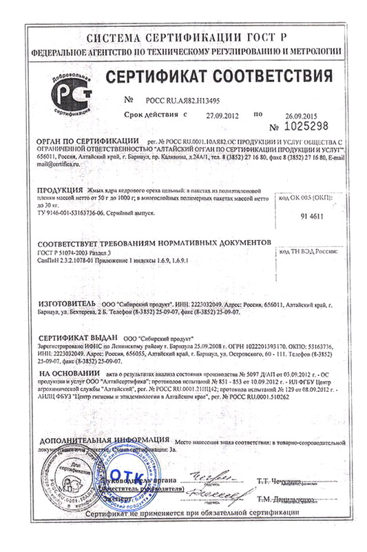 Сертификат ООО «Сибирский продукт». Жмых ядра кедрового ореха