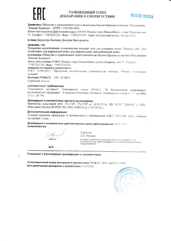Декларация ООО НПО «Компас Здоровья». Гель для умывания серии «Нежный лен»