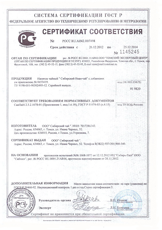 Сертификат ООО «Сибирский чай». Напиток чайный «Сибирский Иван-чай» с добавками