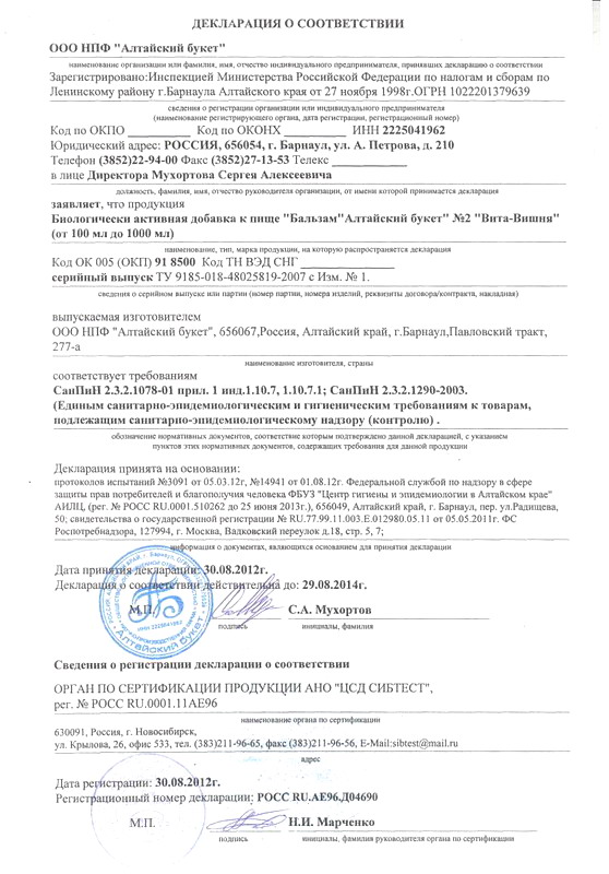 Декларация ООО НПФ «Алтайский букет». Бальзам «Вита-Вишня»
