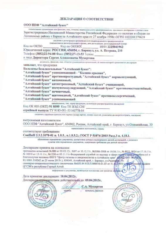 Декларация ООО НПФ «Алтайский букет». Бальзамы безалкогольные