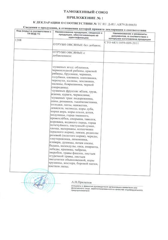 Приложение № 1 к Декларации НПО «Компас Здоровья». Отруби овсяные