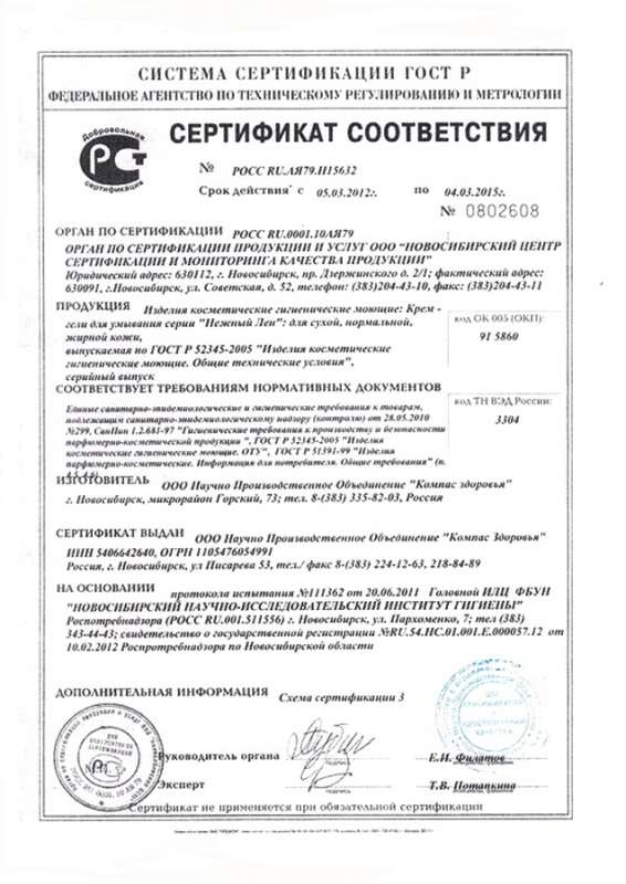 Сертификат НПО «Компас Здоровья». Изделия косметические гигиенические