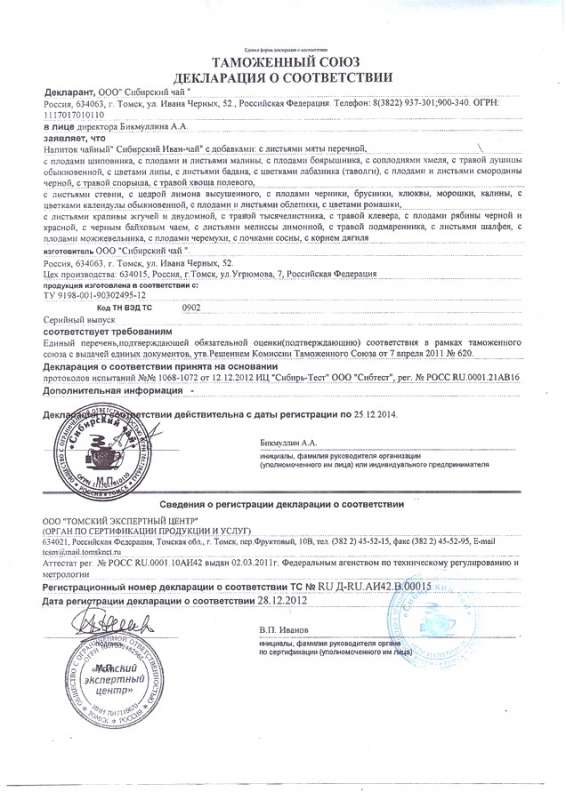 Декларация ООО «Сибирский чай». Напиток чайный с добавками