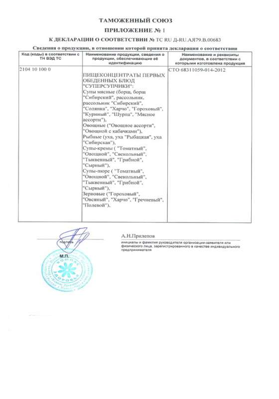 Приложение № 1 к Декларации НПО «Компас Здоровья». Пищеконцентраты первых обеденных блюд