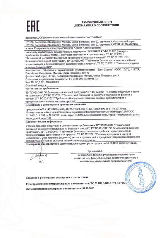 ГлавнаяСертификатыДекларация ООО «ОптОил». Бальзамы безалкогольные, маркировка «Зеленый кофе SLIM»