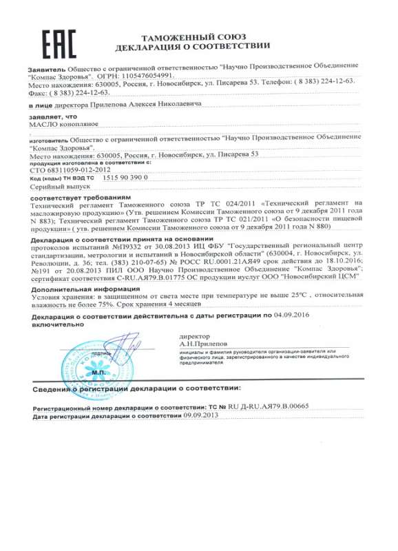 Декларация НПО «Компас Здоровья». Масло конопляное
