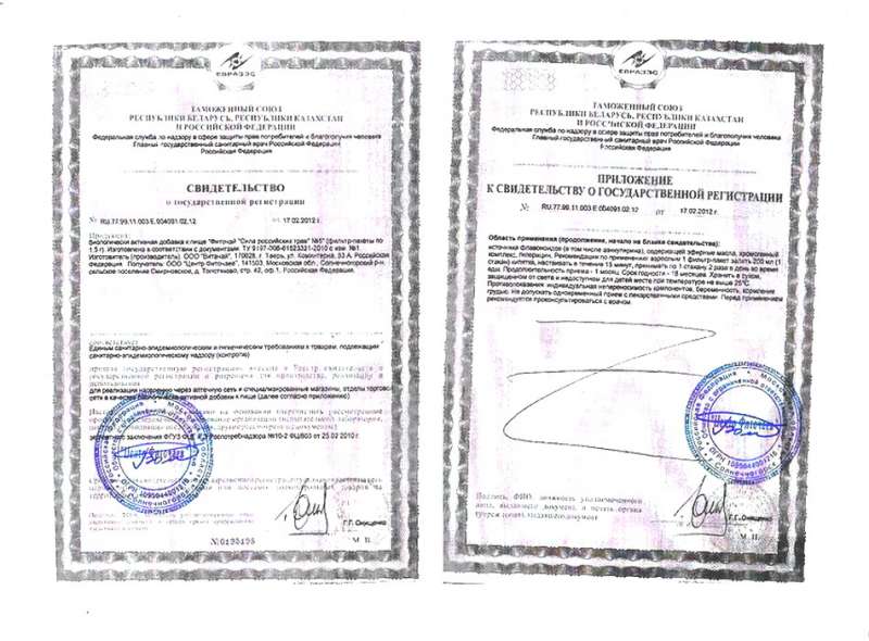 Свидетельство и приложение ООО «Центр Фиточаев». Фиточай №1
