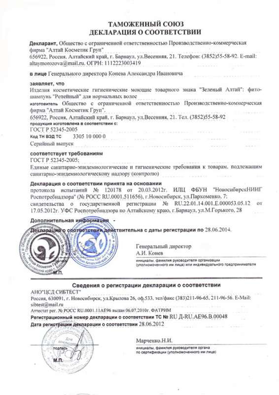 Данная Декларация о соответствии подтверждает изготовление продукции ООО Производственно-коммерческая фирма «Алтай Косметик Груп» в соответствии с ГОСТ. Изготовитель «Алтай Косметик Груп».Продукция фито-шампунь: «Репейный» для нормальных волос.