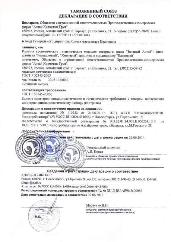 Данная Декларация о соответствии подтверждает изготовление продукции ООО Производственно-коммерческая фирма «Алтай Косметик Груп» в соответствии с ГОСТ. Изготовитель «Алтай Косметик Груп».