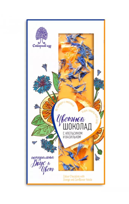 Цветной шоколад «Сибирский кедр» – это утонченное сочетание натурального шоколада, кусочков апельсина и лепестков василька. Радуга вкусов цветного шоколада, легко поднимет настроение всем, у кого окажется в руках это шоколадное совершенство. Не упустите возможность попробовать и насладиться неповторимым ароматом качественного шоколада.