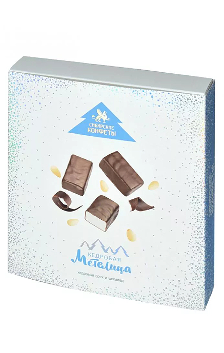 «Кедровая метелица» – это традиционное лакомство с истинно сибирским акцентом: классическое молочное пралине, дополненное кремовым оттенком кедрового орешка и покрытое нежной шоколадной глазурью.
