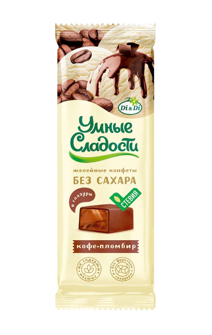 Желейные конфеты в глазури «Умные сладости» Кофе-пломбир – вкусные и полезные конфеты без сахара и фруктозы, не содержат глютен. Идеальное решение для сладкоежек, которые следят за своим питанием и фигурой. Конфеты изготовлены на основе природного подсластителя – стевия. Она низкокалорийна, благотворно влияет на организм, снижает нагрузку на сердце, нормализует метаболизм, улучшает состояние кожи, не вызывает кариес. В качестве желирующего агента в конфетах используется пектин, он является источником клетчатки. Желейные конфеты имеют мягкую и слегка тягучую консистенцию, нежно обволакивая кишечник, выводят токсины естественным путем. Рекомендованы при диабете, а также для похудения. Не упустите возможность попробовать эти уникальные конфеты и насладиться их вкусом и ароматом. Выбирая желейные конфеты «Умные сладости», Вы делаете правильный выбор в пользу здоровья и радости.