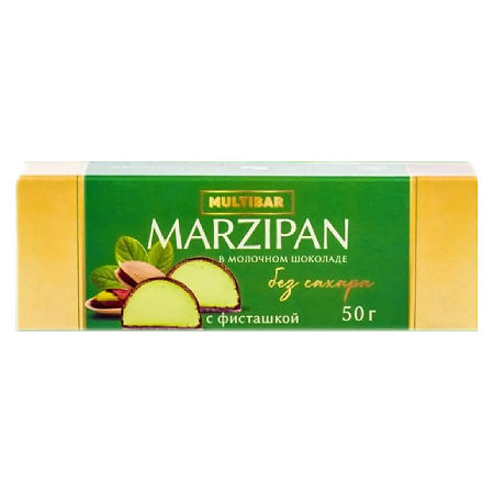 Марципан с фисташкой Multibar – это низкоуглеводный марципановый батончик без сахара в молочном шоколаде. Марципан Multibar содержит только натуральные ингредиенты. Вместо сахара используется сахарозаменитель Аллюлоза, благодаря которому марципан Multibar обладает низким ГИ, почти в два раза менее калорийный, чем обычные марципановые конфеты.