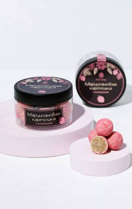 Марципановая картошка – мягкие марципановые конфеты на основе протёртых ядер отборного миндаля с добавлением: нежнейшего кедрового ореха и ароматной клубники, покрыты белым шоколадом. Уникальный купаж сливочных-ореховых, ярких ягодных и шоколадных нот создает незабываемое вкусовое ощущение. Пикантный марципановый вкус и яркое послевкусие удивят даже бывалых ценителей сладостей. Марципановая картошка прекрасное дополнение к чаю или любому другому любимому напитку, может быть и самостоятельным перекусом – это марципановое лакомство никого не оставит равнодушным. Благодаря своей универсальности, подходит как для повседневного употребления, так и для особых случаев и торжеств.