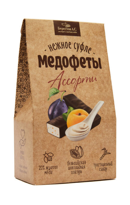 Медофеты Берестов А. С. – лёгкое и полезное лакомство. Это воздушное суфле, покрытое бельгийской шоколадной глазурью. Ключевым элементом Медофет является мёд (его в конфете 20%!). Вкус Медофет не приторный, а с приятной медово-фруктовой кислинкой. Каждый ингредиент в «Медофетах» тщательно отобран и является лучшим в своём роде.