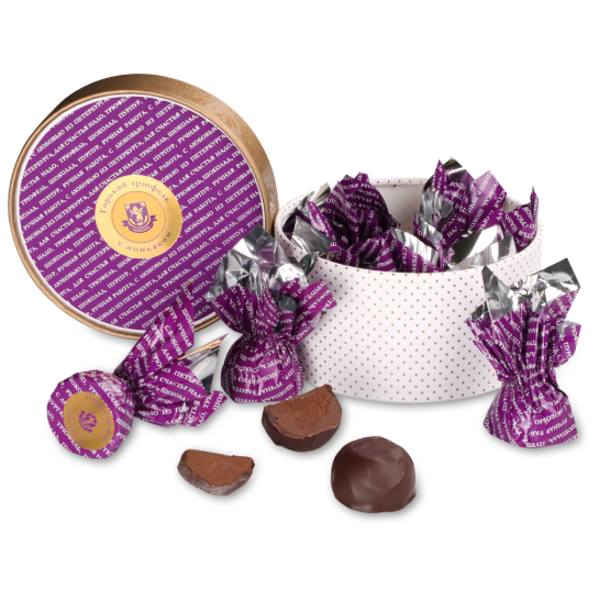 Восхитительный трюфель горький с коньяком «Пурпур» завернут в красивую дизайнерскую обертку и упакован в подарочную коробку, прекрасный вариант подарка для коллег, друзей и близких на день рождения, юбилей и другие особенные поводы. Не упустите возможность попробовать настоящее удовольствие от фабрики «Пурпур».