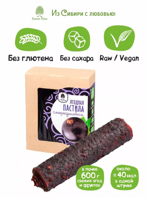 Пастила ягодная «Сибирский кедр» смородиновая – это натуральная пастила без сахара из самых полезных ягод, которое бережно высушивается при определенной температуре. Не содержит глютен. Ягодная пастила обладает насыщенным вкусом и ароматом. Богата витаминами макро- и микроэлементами. Изготовлена пастила по старинным рецептам. Технология низкотемпературной сушки (до 35°С) позволяет компонентам (железо, фосфор, натрий, калий, кальций и магний) не распадаться и полностью усваиваться организмом. В 100 граммах пастилы – 600 гр. свежих ягод!
