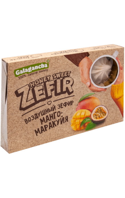Зефир Galagancha изготавливается из яблочного пюре с добавлением небольшого количества сахара и белка. К классическому рецепту добавили фруктовые наполнители манго и маракуйии и мёд. Получился десерт с неповторимым экзотическим вкусом и лёгкой кислинкой.