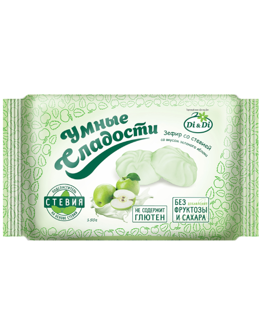 Нежный, воздушный зефир со вкусом сочного, зеленого яблока «Умные сладости» – полезная альтернатива обычному зефиру. Не содержит глютен. Зефир изготовлен без добавления сахара и фруктозы.