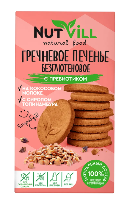 Печенье гречневое NutVill с пребиотиком, разработано по уникальному рецепту при участии диетологов. По-настоящему здоровый перекус и вкусное лакомство без сахара, лактозы, яиц, красителей и консервантов. Идеальное печенье для тех, кто следит за своим питанием, но не готов отказываться от сладкого вкуса. Подходит веганам и вегетарианцам.