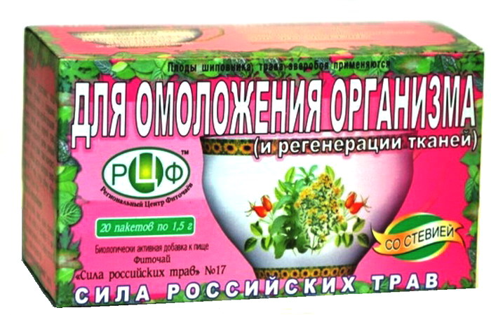 Фиточай для омоложения организма №17 поддерживает и продлевает молодость. Он замедляет возрастные изменения в организме. Входящие в состав чая листья шалфея обладают противовоспалительным, антимикробным, общеукрепляющим свойствами, а также повышают активность пищеварительного тракта. Плоды шиповника и боярышника очищают кровеносную систему и улучшают обмен веществ. Помогают избавиться от солей тяжелых металлов, снижают в крови уровень холестерина. Содержат много витаминов. Трава зверобоя используется как вяжущее и тонизирующее средство. Способствует укреплению десен. Листья мяты используют для лечения головных болей, сердечнососудистых заболеваний, также камнях в почках и атеросклерозе. Трава пустырника благотворно влияют на нервную систему, снижая возбудимость. Улучшает работу внутренних органов, стимулирует сокращение сердечной мышцы, снимает спазм сосудов. Цветки ромашки оказывают спазмолитическое, противовоспалительное, желчегонное действия. Листья стевии улучшают пищеварение, активизирует деятельность почек и печени. Трава тысячелистника обеспечивает спазмолитическое действие на гладкие мышцы; и усиливает секрецию желудочного сока. Цветки календулы и липы обладают противовоспалительными спазмолитическими свойствами. Стабилизируют давление, помогают бороться с аритмиями. Плоды рябины помогают при сахарном диабете, особенно протекающем с поражением мелких сосудов, при нарушениях желудочно-кишечного тракта. Фиточай для омоложения организма содержит семена льна. Они способствуют улучшению общего состояния организма, зрения и обмена веществ.