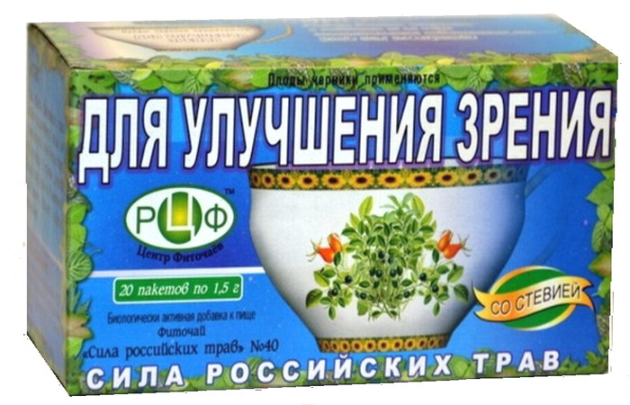 Фиточай для улучшения зрения №40 улучшает зрение, а также способствует нормализации метаболизма в сетчатке глаза и зрительном нерве. Укрепляет стенки сосудов глазного дна. Фиточай для улучшения зрения содержит в своем составе плоды черники обыкновенной и рябины усиливают остроту зрения, улучшают сумеречное зрение. Содержат большое количество провитамина А, который способствует регенерации зрительного пурпура, и повышает его устойчивость к инфекциям. Трава зверобоя укрепляет стенки капилляров, улучшая их эластичность. Она способствует кровоснабжению сетчатки глаз, регулирует обменные процессы в организме. Плоды шиповника используются как тонизирующее средство. Они улучшают окислительно-восстановительные процессы, усиливают синтез гормонов и обновление тканей. Почки березы содержат большое количество антибактериальных веществ. Содержится в них каротин, который необходимый глазам. Корневище с корнями девясила помогает отодвинуть преждевременное старение. Чабрец помогает восстанавливать память и борется с катарактой. Листья стевии обладают уникальными лечебно-профилактическими и оздоровительными свойствами. Они улучшают иммунную систему, содержит много полезных для организма человека веществ. Корневище аира понижает артериальное давление и восстанавливает зрение.