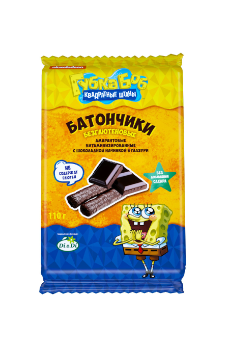 Батончики безглютеновые Губка Боб с шоколадной начинкой, витаминизированные.