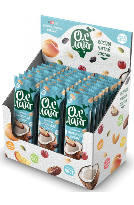 Фруктово-ореховые батончики Ол'Лайт шоколад и кокос, 30 г. Цена за упаковку - 25 шт.