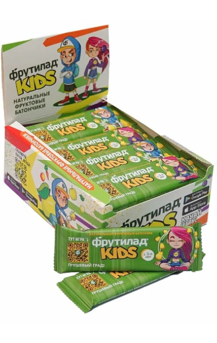 Натуральные батончики «Фрутилад KIDS» специально для детского питания. Батончик Грушевый град! из асептически упакованного высококачественного грушевого и яблочного пюре, сушеных яблок. Мягкий по текстуре батончик, без косточек и осколков, чтобы не повредить молочные зубки! Каждый вкус представлен в двух вариантах: с главным персонажем девочкой или мальчиком. На каждом батончике есть QR-код для перехода на сайт Фрутилад KIDS и скачивания мобильной игры.