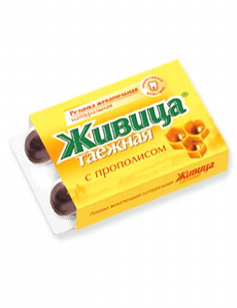 Жевательная резинка с прополисом «Живица» обладает бактерицидными и клеящими свойствами, она прекрасно очищает зубы от остатков пищи и дезинфицирует полость рта. Живица таежная получена путем очистки смолы, собранной в Хакасской тайге. Она представляет собой загустевшую смолу хвойных деревьев, вытекающую при повреждении коры. В состав прополиса входят различные органические кислоты, ненасыщенные углеводороды, дубильные вещества, витамины. Он способен уничтожать большинство вредоносных микроорганизмов, даже стойких к серьезным антибиотикам, нейтрализует соли тяжелых металлов, расщепляет канцерогенные смолы, стимулирует иммунную систему. Жевательная резинка с прополисом обладает оригинальным вкусом и полезна для желудочно-кишечного тракта, хорошо помогает при изжоге и укачивании, освежает дыхание.