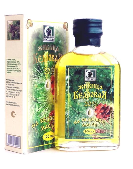 Живица кедровая 20% в кедровом масле Сибирский продукт представляет собой композицию масла холодного отжима из семян ореха сибирского кедра и его природной живицы (смолы). Масло является экологически чистым, натуральным продуктом. Живица кедровая 20% удивительна тем, что она содержит абсолютно все известные микро- и макроэлементы, все витамины, все незаменимые аминокислоты и наиболее легко усваиваемые жиры. Полиненасыщенные кислоты участвуют в построении и развитии клеток нашего организма, регулируют жировой и холестериновый обмен, нормализуют кровообращение, способны выводить токсины, радионуклиды. Живица кедровая 20% используется для закапывания, массажа, втирания и смазывания.