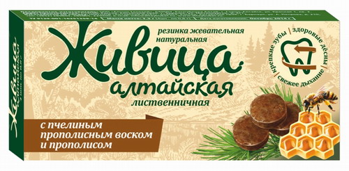 Живица алтайская лиственная с пчелиным прополисным воском и прополисом производится методом подсочки, то есть надрезанием дерева для извлечения живицы с последующим добавлением прополисного воска и прополиса. Кедровая и лиственничная живица являются основными ингредиентами многих зубных паст и ополаскивателей для рта. Выступают в роли основного сырья для производства жевательных резинок и пастилок, предназначенных для борьбы и профилактики заболеваний десен и зубов. Пчелиный прополисный воск обладает очищающим и укрепляющим действиями. Хорошо защищает десны от воспалений. Прополис в составе продукта усиливает действие воска. Также он обладает противомикробным действием и широким спектром действия на микроорганизмы. Жевательная резинка и таблетки с прополисом эффективны для лечения воспалительных заболеваний ротовой полости, горла. После всасывания, они также улучшают иммунитет, регулируют содержание липидов и сахара в крови.