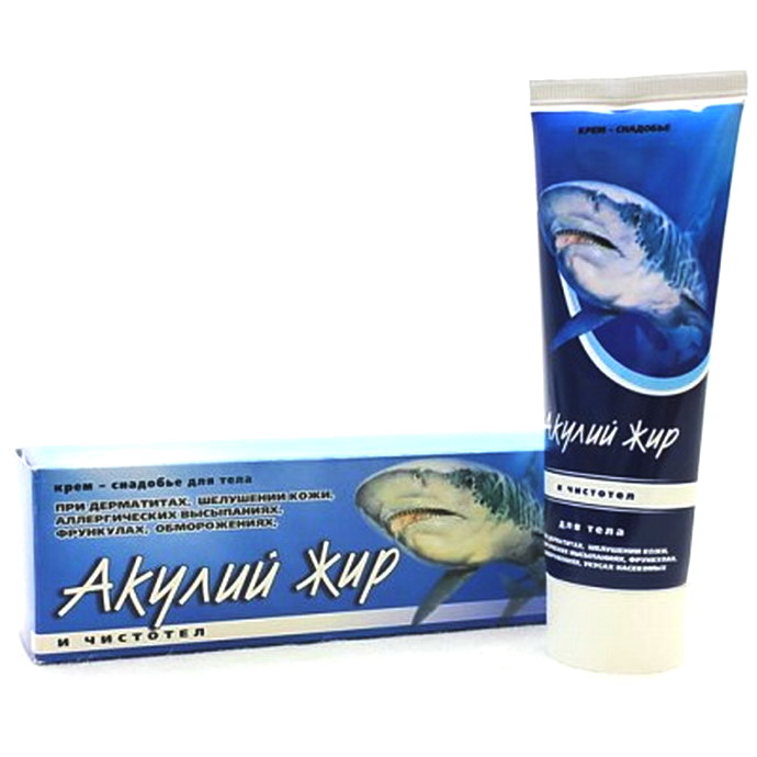 Лечебные свойства: крем Акулий жир и чистотел дезинфицирует и смягчает поверхность кожи. Устраняет кожный зуд при аллергическом и инфекционном дерматите.
