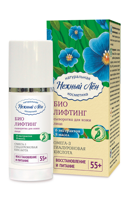 Сыворотка для лица после 55 лет «Био лифтинг 55+» серии рекомендуется для женщин среднего возраста, когда кожа становится более тонкая и начинает хуже увлажняться и ее повреждения заживают медленнее. А потеря эластичных тканей ведет к появлению морщин. Сыворотка для лица после 55 повышает эластичность и увеличивает ее упругость. Подтягивает и укрепляет кожу, уменьшая тем самым глубину морщин и их количество. Сыворотка для лица после 55 замедляет возрастные изменения, способствуя поддержке прочности тканей кожи. В состав сыворотки входит Гиалуроновая кислота, которая обеспечивает глубокое увлажнение и стимулирует процессы регенерации. Масла, входящие в состав, содержат Омега-3 жирную кислоту, которая предотвращает уменьшение эластичности. Они улучшают метаболические процессы в клетках. Сохраняют водный и жировой баланс кожи, снимают ее раздражение. Экстракты нормализуют микроциркуляцию крови и способствуют уменьшению отечности. Они также богаты витаминами и микроэлементами. Улучшают регенерацию слизистых оболочек.