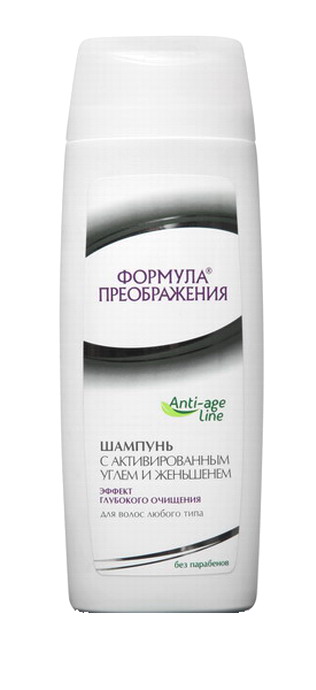 Шампунь с активированным углем и женьшенем «Формула преображения. Anti-age line» используется для более частого применения, чем другие шампуни. Шампунь с активированным углем применяют при уходе за волосами любого типа, когда наблюдается повышенная секреции сальных желез и предрасположенность к образованию перхоти головы. В состав шампуня входит активированный уголь. Он облегчает впитывание поверхностные и более глубокие загрязнения из пор кожи. Также очищает кожу от перхоти, снимает статическое электричество с поверхности волос. Биоантиоксидантный комплекс женьшеня «Неовитин» оздоравливает состояние кожи, помогает снимать воспаление, улучшает микроциркуляцию крови.