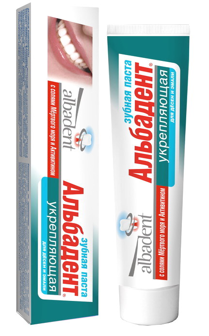 Зубная паста Укрепляющая Альбадент с противовоспалительным действием улучшает минеральный обмен в тканях пародонта. Она способствует укреплению зубной эмали и дёсен. Зубная паста Укрепляющая содержит в своем составе компонент «Активитин». В него входят лечебные травы и добавки, которые способствуют удалению зубного налета и усиливают защиту от кариеса. Также содержит соли Мёртвого моря. Они улучшают минеральное питание, укрепляют зубную эмаль. Композиция эфирных масел обладают хорошими оздоровительными и освежающими свойствами.